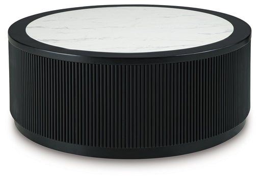 Signature Design by Ashley®Elevate your living space with sleek sophistication. Sporting a bold drum silhouette in a matte finish, this table is topped with faux Carrara marb...