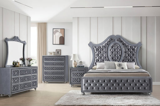 Crown MarkDark Grey or Black Velvet Microfiber upholstered bedroom set. Immerse yourself in the regal charm of this majestic bedroom collection, a true embo...