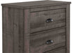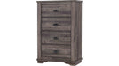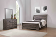 Rough hewn look in a dark grey wash finish, bracket feet and bronze finish half-moon pulls. Kenlin center drawer guides with stops. This bedroom collection brings a touch of understated elegance to your sanctuary with its soothing, contemporary design. The bed, with its clean, horizontal lines and a gently sloped headboard, provides a modern yet timeless aesthetic that encourages rest and relaxation. Accompanied by a dresser with a complementary framed mirror, a tall chest, and a nightstand, each piece is finished in a subtle gray that enhances the natural beauty of the wood grain. The black metal pulls add a refined detail, seamlessly blending with the collection's serene and sophisticated feel.
