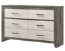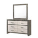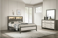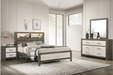 Embrace the harmonious blend of minimalist design and rustic appeal with this captivating bedroom collection. The sleek, low-profile bed is a modern take on farmhouse style, featuring a plank-style headboard with built-in lighting that adds warmth and convenience. Accompanying the bed are the clean-lined dresser and mirror, a chest, and a nightstand, all finished in a distressed wood tone that highlights the grain and character of the material. Contrasting white drawer fronts with simple, yet elegant, metal pulls add a contemporary touch, while providing ample storage space for a clutter-free environment.