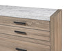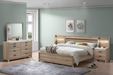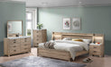 This bedroom collection brings a breath of fresh air to any interior with its light, natural wood finish that evokes a sense of calm and simplicity. The well-crafted bed frame, with its clean lines and subtle headboard design, provides a modern rustic charm that's both understated and inviting. Stylish night stands with integrated lighting backs flank the bed, creating a wall bed effect. Faux stone tops accent the storage pieces for extra luxury. Available in King or Queen size.