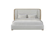 The fully upholstered headboard features clean vertical channel detailing framed by rounded oak-finished edges, creating a harmonious balance between structure and softness. Its plush, durable performance fabric offers lasting comfort and easy maintenance, ideal for everyday living.