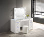 Step into a world of glamour with this sleek and chic vanity set, a perfect fusion of functionality and fashion. Its glossy white finish and clean lines are complemented by the sparkle of crystal-like knobs, adding a touch of sophistication to your personal space. The spacious tabletop, graced with a large mirror surrounded by radiant lights, offers an ideal stage for beauty routines, ensuring flawless makeup application under impeccable lighting. With a variety of drawers, this vanity provides ample storage to keep essentials organized and within reach. Interior drawer lighting, integrated outlet, and hidden drawer storage are just some of the included features.