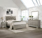This bedroom set embodies a refined elegance with its soft silver hue and luxurious textures, perfect for creating a serene and sophisticated sanctuary. The centerpiece is a sumptuous bed framed by a headboard with diamond-tufted detailing, offering a touch of opulence. The accompanying pieces, including a dresser with a gracefully matching mirror, tall chest, and nightstand, all feature a textured finish that adds depth and character to the suite.
