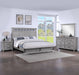 This bedroom suite offers a refreshing take on rustic charm, featuring a soft greige finish that highlights the natural wood grain. The sturdy bed stands as the centerpiece with its robust headboard and inviting design, while the accompanying pieces — a nightstand, dresser, and chest — provide ample storage, each fitted with understated hardware that accentuates the collection's country-inspired look.