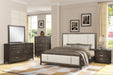 The Fulton Upholstered Panel Bed exudes modern sophistication with its elegantly framed headboard featuring plush upholstery, perfect for creating a serene retreat in any bedroom. The rich, dark wooden frame contrasts beautifully with the light fabric, adding a touch of contemporary charm and warmth to your space. Sturdy and stylish, this bed provides a solid foundation for your mattress while offering ample comfort for night-time relaxation. Combined with a Dresser, Mirror. Chest of Drawers, and a Nightstand, the clean lines and minimalist design make it an ideal choice for those who appreciate understated elegance combined with practical functionality.