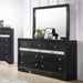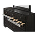 Black/Silver Storage Bedroom Set. Black finish Hidden drawers on case pieces (silver panel camouflage) Dovetail drawer construction with Kenlin metal drawer glides Dustproof bottoms seal your case and give added strength. All cases feature extra felt-lined accessory drawers with dividers.