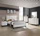 This contemporary bedroom set presents a crisp, clean look with its white finish and contrasting dark accents. The simple, straight lines and subtle details give it a modern edge. The bed features a paneled headboard that makes a statement without overwhelming the space. The accompanying pieces, including a six-drawer dresser, a five-drawer chest, and a two-drawer nightstand, provide ample storage with a streamlined silhouette. A matching mirror adds functionality and completes the look, creating a cohesive and stylish bedroom environment. This set is perfect for those who appreciate understated style and practical design.