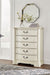 Add a touch of romance to your bedroom with this chest of drawers. Its antiqued white painted finish and serpentine-shaped silhouette details are the picture of easy elegance. Five spacious drawers offer ample storage space, while custom-designed bar pulls add originality.