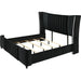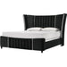 The dramatic wingback headboard features vertical channel tufting for a rich, textured look, while the footboard and rails are quilted for added visual depth. This glamorous bedroom ensemble brings modern sophistication to any space with its bold, black velvet upholstery and high-contrast chrome accents.