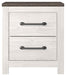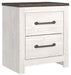 Cool, clean and casually modern. This nightstand's wispy whitewash and gray finish sets the tone for your calming sanctuary. Large linear pulls add dimension and authenticity. Two smooth-gliding drawers neatly accommodate your bedside needs.