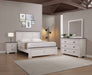 This bedroom set embodies a breezy, transitional style that harmonizes with any decor. The gracefully designed bed, with its panel headboard and soothing finish, invites a sense of calm and simplicity. Complementing the bed are the dresser and mirror, tall chest, and nightstand, each exhibiting a clean-lined structure and finished in a gentle hue that mimics the soft touch of morning fog. Classic hardware accents provide an understated elegance, while ample storage space in each piece ensures practicality meets sophistication.