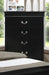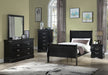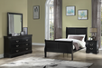 Crown Mark B3950 Louis Phillipe Black Bedroom Group with Twin, Full, Queen, or King Bed, Dresser, Mirror, 5 Drawer Chest and a Night Stand. Wood Veneers & Solids, Select Asian Hardwoods, Hardwood Veneers in a Black Painted Finish. English and French dovetailing to maximize storage capacity and strength. Crown Molding, Bracket Feet, Slightly Rounded Edges, Elevate your sanctuary with this timeless bedroom collection that exudes classic charm with a modern twist. Each piece is bathed in a sharp, black finish that brings a rich and elegant feel to any space. The bed anchors the room with its gracefully curved headboard footboard, providing a stylish backdrop for plush bedding. Complementary case goods offer ample storage, with smooth, silver-toned handles adding a subtle touch of refinement.