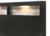 This elegant bedroom collection exudes sophistication with its sleek, dark finish and modern design. The sturdy construction of each piece showcases a rich, textured wood grain, offering both durability and style. The bed, the centerpiece, features a bold, high headboard with built-in shelving and decorative back panels, enhanced by soft illumination for a cozy ambiance. Faux marble tops and sleek knobs accent the case pieces. The harmonious blend of straight lines and minimalistic design ensures this collection will anchor a bedroom with a contemporary yet timeless appeal.