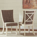 The beauty of this upholstered dining chair is something to savor. Contoured seat cradles you in cushioned comfort while lattice peekaboo detail on the back makes this a striking chair from all angles. Heavy woven fabric adds textural interest that complements the chair’s antiqued white finish.
