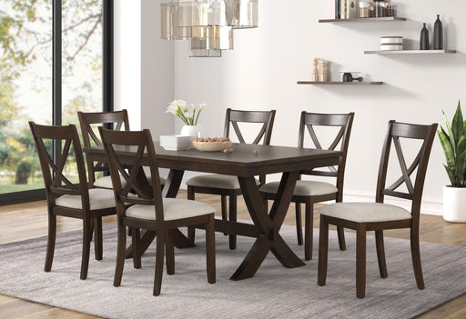CTCDIN8655D7P Brown 7pc Dining Set W/6 Side Chairs Features: Trestle Table Crossback All Wood Side Chairs with Upholstered Seats Wood: Brown Finish ...