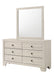 This bedroom collection embodies a rustic, yet contemporary aesthetic with its clean lines and neutral color palette. The set includes a low-profile bed frame, a dresser with a mirror, and a tall chest, all finished in a versatile white wash that easily complements any decor. The sleek metal handles on the drawers add a touch of contemporary flair, while the large mirror reflects light, making the space feel brighter and more open.