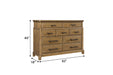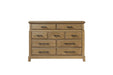 Make a statement in your bedroom with this beautifully crafted Dresser in Elm Veneers, designed to offer both generous storage and elevated style. Finished in a warm caramel tone, the elm veneer construction showcases natural wood grain variations that bring character and depth to the piece. This spacious dresser features nine framed drawers in a thoughtful layout—ideal for organizing clothing, linens, and accessories. The top drawers are perfect for smaller items, while the larger bottom drawers accommodate bulkier belongings. Each drawer is accented with bold, dark metal bar pulls, providing an industrial contrast that complements the warm wood finish. Resting on block feet for added stability, the dresser blends traditional craftsmanship with modern design sensibilities, making it a versatile choice for rustic, transitional, or farmhouse-inspired interiors. With its balanced proportions and rich texture, this dresser is the perfect blend of form and function.
