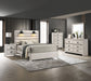 This bedroom set marries rustic appeal with contemporary lines, offering a cozy yet refined aesthetic to any modern home. The set features a generously sized bed with a broad, planked headboard with integrated sconces, creating an inviting ambiance. Flanking the bed are a matching nightstand and a chest, each providing ample storage with a series of drawers that glide open effortlessly. The dresser, complete with a wide mirror, offers additional storage and an area to get ready, all while contributing to the room’s open feel. The distressed wood finish of each piece is complemented by dark metal hardware, adding an industrial touch to the ensemble.