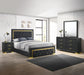 This bedroom collection offers a sophisticated palette of black and gold, presenting a refined look that's both modern and timeless. The bed anchors the set with its plush, button-tufted headboard framed by a bold, gold accent trim, creating a luxurious focal point. The matching dresser, chest, and nightstand feature sleek, black surfaces complemented by gold hardware, adding a touch of elegance. Each piece stands on neat gold-finished legs, lifting the furniture off the ground and enhancing the feeling of spaciousness. The dresser's large mirror reflects light and adds depth, making it as functional as it is stylish.