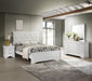 This bedroom set embodies a refined elegance with its crisp white hue and luxurious textures, perfect for creating a serene and sophisticated sanctuary. The centerpiece is a sumptuous bed framed by a headboard with diamond-tufted detailing, offering a touch of opulence. The accompanying pieces, including a dresser with a gracefully matching mirror, tall chest, and nightstand, all feature a textured finish that adds depth and character to the suite.