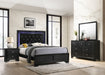 Step into a realm of sophistication and comfort with this stunning bedroom collection. Each piece showcases an exquisite blend of traditional charm and contemporary flair, making a bold statement with its textured surfaces and rich black finish. The bed, a centerpiece of luxury, features a sumptuous, tufted headboard with integrated lighting that invites a touch of opulence to your restful retreat. Coordinating storage solutions, including a dresser, chest, and nightstand, offer ample space with their gracefully designed drawers, accented with shimmering hardware that complements the set’s chic aesthetic.