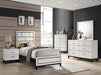 This contemporary bedroom set presents a crisp, clean look with its white finish and contrasting dark accents. The simple, straight lines and subtle details give it a modern edge. The bed features a paneled headboard that makes a statement without overwhelming the space. The accompanying pieces, including a six-drawer dresser, a five-drawer chest, and a two-drawer nightstand, provide ample storage with a streamlined silhouette. A matching mirror adds functionality and completes the look, creating a cohesive and stylish bedroom environment. This set is perfect for those who appreciate understated style and practical design.