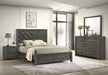 This bedroom collection encapsulates a blend of contemporary design and rustic charm. The centerpiece, a bed with a distinguished chevron patterned headboard, evokes a sense of craftsmanship and texture, infusing the space with character. Flanking the bed are matching pieces, each exhibiting clean lines and a weathered wood finish that suggests a lived-in elegance. The dresser, complemented by a substantial mirror, along with the tall chest, offer ample storage solutions with understated metal handles that enhance the modern farmhouse aesthetic. A nightstand completes the set, its compact design making it a practical addition to the suite.