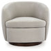 Approachable with its classic barrel design, this swivel accent chair invites stylish relaxation to the everyday. Curl up in its velvet upholstered seat—relaxing with a book or your favorite show has never been so comfortably luxurious. Completing the look, a wood swivel base provides a chic contrast to the fabric’s light neutral hue.