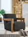 This accent chair’s air of authentic character is well-suited for your casual seating area. With its robust cushion covered in charcoal and brown boucle fabric, comfort and style go hand in hand. Angular wood arms, finished in a warm brown, provide a beautiful contrast to the softly curved seat.