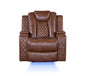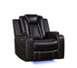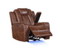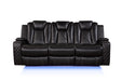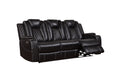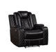 Sofa includes drop-down center table with AC/USB adapters, under-arm storage, cup holders and adjustable reading lights