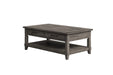 Experience the perfect blend of functionality and style with the Hartford Cocktail Table with Lift Top. This innovative piece features a smooth lifting mechanism, allowing you to raise the table surface for dining or working, directly from your sofa. Crafted in a weathered grey finish, it boasts a rustic charm with two handy drawers and a spacious lower shelf for optimal storage and organization. Complete with sturdy wheels for easy mobility, this cocktail table is an essential addition to any living space.