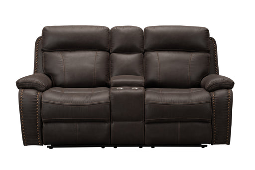 LaVidaColton Dual Power Reclining Console Love Seat Under Center Armrest Storage and Cup Holders In Brown Polished Microfiber Breathable Leather-Like Uph...