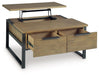 Give your space a sleek, urban edge with this table. A light wood-tone finish and a contrasting frame create a modern mixed-material look that pairs effortlessly with today’s sofas and sectionals. The spring-lift top glides up to create a convenient workspace or dining surface, while dual smooth-gliding drawers keep remotes, tech and clutter neatly out of sight. This table is polished, put together and needs a good home.