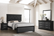 This bedroom set embodies a refined elegance with its rich black hue and luxurious textures, perfect for creating a serene and sophisticated sanctuary. The centerpiece is a sumptuous bed framed by a headboard with diamond-tufted detailing, offering a touch of opulence. The accompanying pieces, including a dresser with a gracefully matching mirror, tall chest, and nightstand, all feature a textured finish that adds depth and character to the suite.