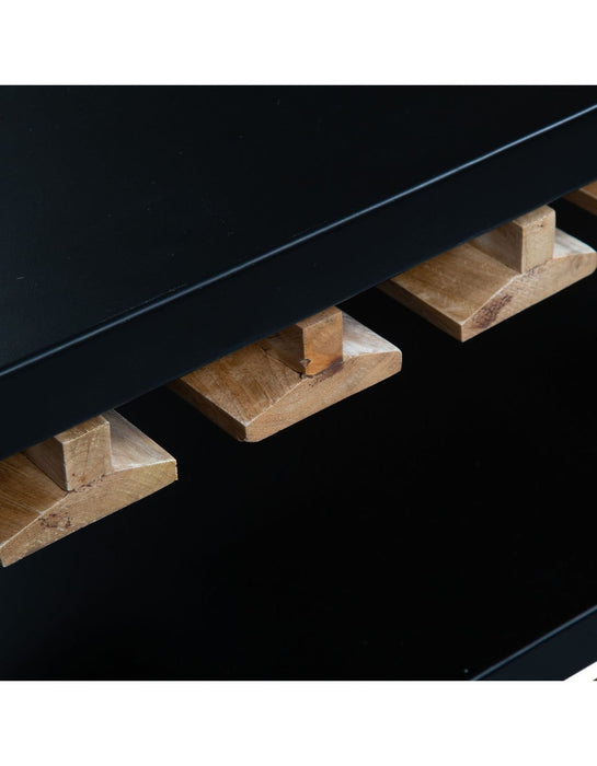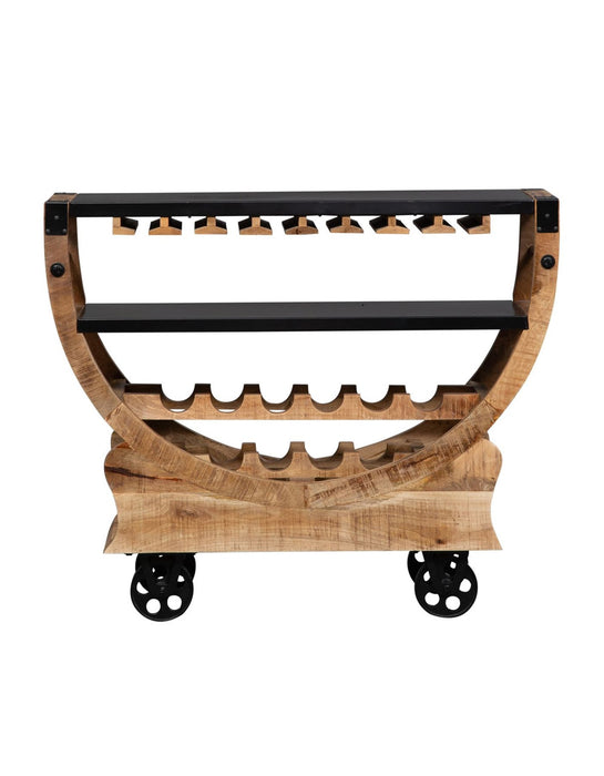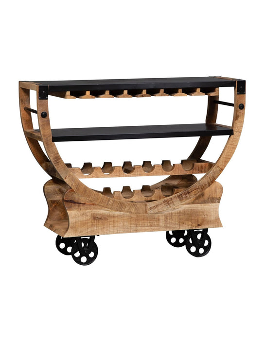 The Danley accent bar trolley offers function with beauty. Crafted of solid rough cut mango with a powder coated metal top and middle shelf for years of durability. Features a stemware rack, 10 bottle wine storage and industrial iron wheels. Easy moveability to any room for a party.