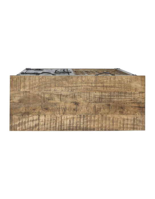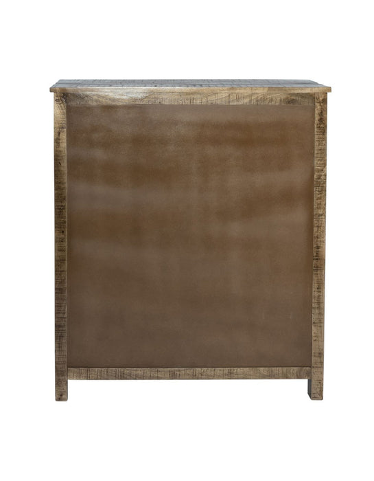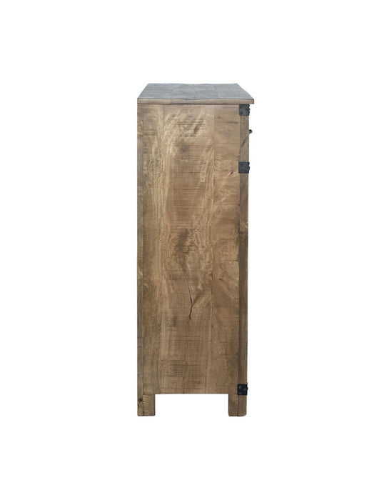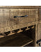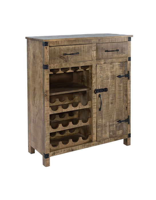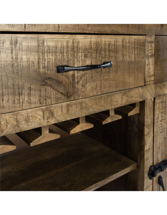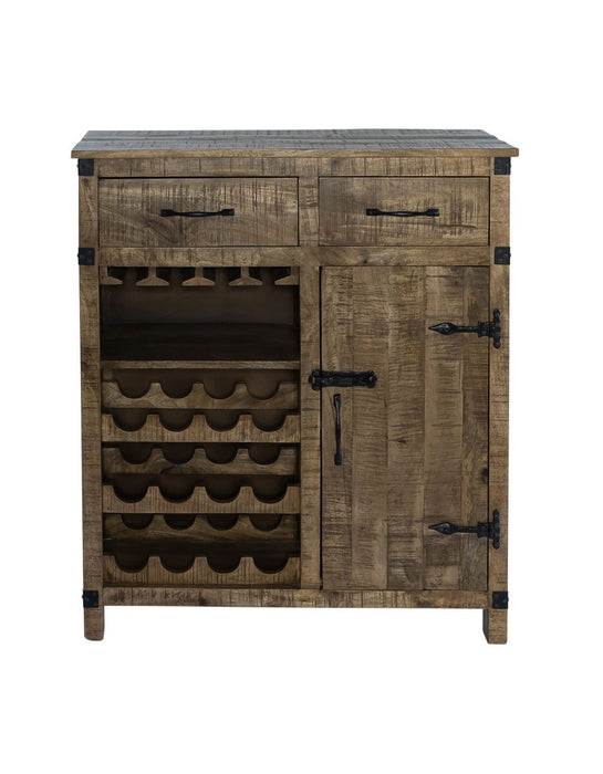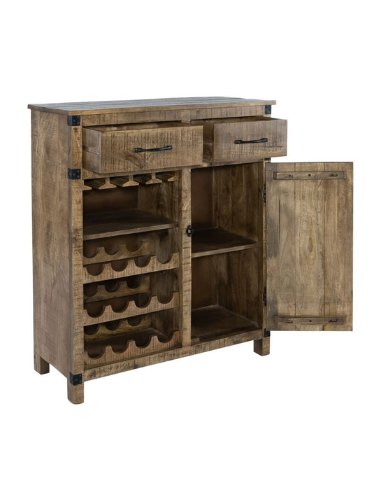 Emerson accent wine bar is just the right scale for smaller space with lots of function. Crafted of solid mango finished in a Weathered Honey. Features one door with fixed shelf behind with an iron door latch, two drawers, 12 bottle wine rack, stemware storage and arrow shaped door hinges. The design will work with all decor from farmhouse to vintage.