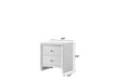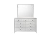 This inviting bedroom set features a refreshing white finish with subtle textural details that add a touch of modernity. The clean-lined bed boasts a distinctive headboard with horizontal slats that create an airy, open feel, promoting relaxation. Complementing the bed is a practical two-drawer nightstand and a taller, multi-drawer chest, both offering ample storage and maintaining the set's sleek look. The spacious dresser, equipped with a variety of drawers, meets all your storage needs and is topped with a large, square mirror that reflects light and adds to the sense of space. This collection is perfect for those looking to brighten up their bedroom with pieces that combine contemporary styling with everyday functionality.