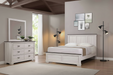 Rustic Country Style in Rough Hewn Chalk Finish with Greyish Wood Top and Accents. Pewter finish metal bale drawer hardware. This bedroom set embodies a breezy, transitional style that harmonizes with any decor. The gracefully designed bed, with its panel headboard and soothing finish, invites a sense of calm and simplicity. Complementing the bed are the dresser and mirror, tall chest, and nightstand, each exhibiting a clean-lined structure and finished in a gentle hue that mimics the soft touch of morning fog. Classic hardware accents provide an understated elegance, while ample storage space in each piece ensures practicality meets sophistication.
