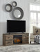 Entertain a rugged yet refined sense of style with this TV stand with LED fireplace insert. Its rustic finish and plank-style details pay homage to reclaimed barn wood, while faux metal banding with nailhead accents infuses a touch of industrial cool. Ultra-clean lines ensure a look that can go from the country to the city and feel equally at home. What really turns up the heat: an electric infrared fireplace insert with faux firebrick surround that operates with or without infrared heat. With the touch of a button, adjust the temperature and the flame brightness, and set the timer for long-lasting enjoyment.