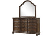 Add a touch of elegance to your bedroom with the Tuscany Dresser Mirror. This beautiful mirror features a traditional styling with a warm mahogany finish that will complement any decor. Measuring 41 inches in height and 44 inches in width, this mirror is the perfect size to mount on top of your dresser. Crafted from high-quality materials, this dresser mirror is built to last. The sturdy frame ensures that the mirror will remain securely in place, while the polished glass surface provides a clear and accurate reflection. Whether you're getting dressed for a special occasion or just checking your appearance before heading out the door, this mirror will help you look your best. In addition to its functional features, the Tuscany Dresser Mirror is also a stylish accessory for your bedroom. The rich mahogany finish adds warmth and depth to your decor, while the timeless design makes it a classic piece that will never go out of style. With its combination of beauty and practicality, this dresser mirror is sure to become a cherished addition to your home.